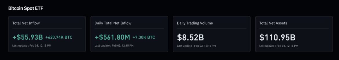 • Recent data shows periods of net outflows, though February 2 recorded inflows aof round $562 million (led by products like FBTC and IBIT), interrupting a prior streak.
