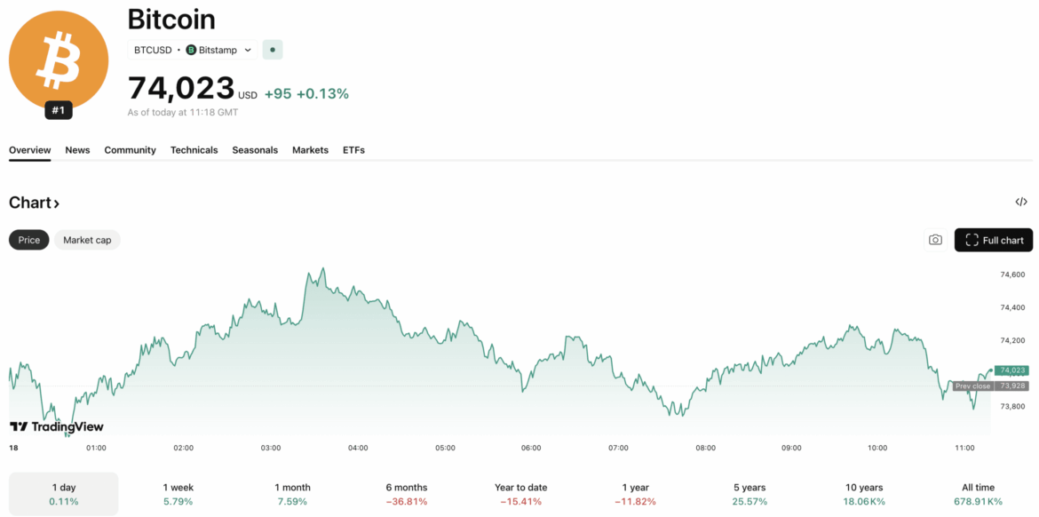 It comes as Bitcoin spent the past 24 hours making very little moves in either direction, up just +0.2% on the daily chart as it trades for $73,900, with $34Bn in daily trading volume.