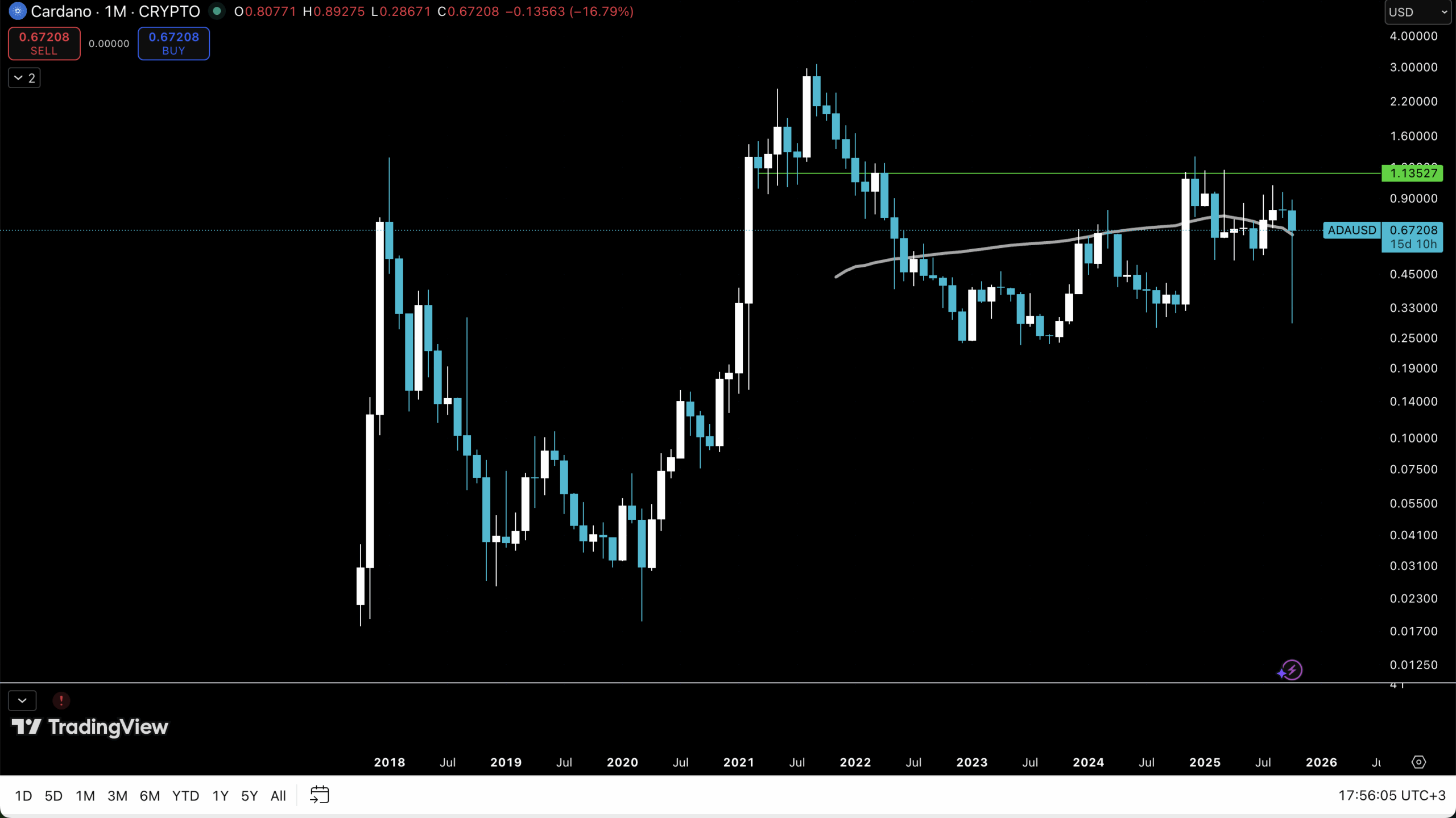 The monthly chart looks promising with the last candle keeping the body above MA50. Still half a month left before it closes – good to keep an eye on. Another key level seems to be $1.13 – previous support and current resistance. Once this level is taken, then previous ATH, at $3 becomes the next target.