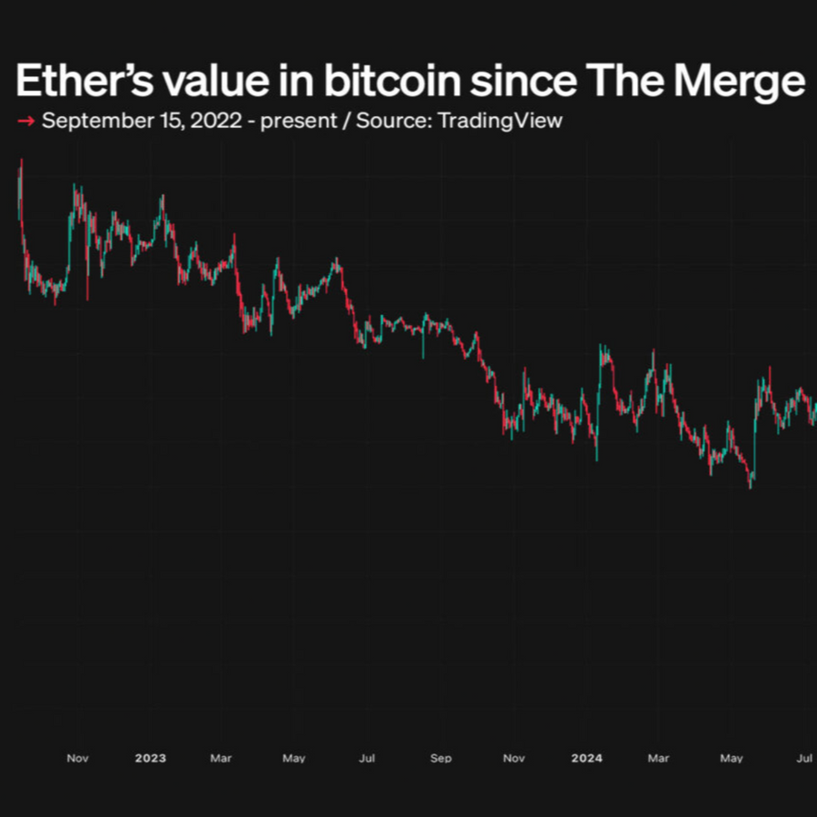 It costs 70% less BTC to buy ETH today than it did two and a half years ago when Ethereum abandoned proof-of-work.
