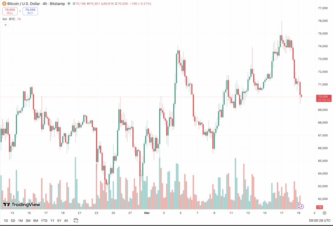 Bitcoin’s immediate reaction was negative, dropping -5.4% overnight to test psychological support at $70,000. The primary driver here isn’t just the rate hold; it is the context behind it.